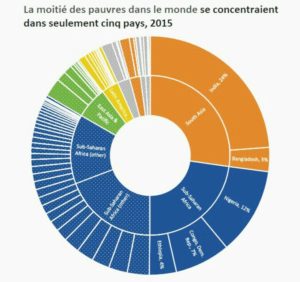 Selon ces statistiques, en 2015, sur les 736 million de personnes qui vivaient dans l’extrême pauvreté, 368 millions, soit la moitié, se concentraient dans seulement cinq pays du monde. Ces pays sont, par ordre décroissant, l’Inde, le Nigéria, la République démocratique du Congo (RDC), l’Éthiopie et le Bangladesh. Ce sont aussi les pays les plus peuplés d’Asie du Sud et d’Afrique subsaharienne, deux régions qui concentrent 85 % des pauvres (629 millions) de la planète.