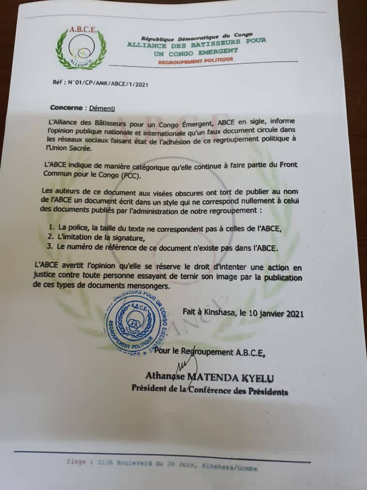 Le regroupement politique Alliance des Bâtisseurs pour un Congo Émergent, ABCE membre du Front Commun pour le Congo a dans un communiqué démenti son adhésion à l’Union sacrée initié par le Chef de l’Etat.