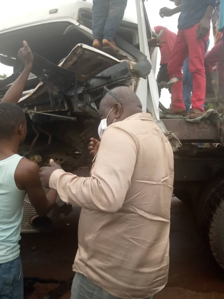 Seul le chauffeur remorque Mercedes Actros qui est coincé et bloqué dans sa cabine avec ses pieds que les villageois essayent difficilement de le sortir, rapporte un témoin oculaire sur le lieu GREGOIRE KASOMBA.