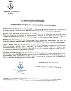 La Fédération des entreprises du Congo (FEC) a informé l’opinion publique dans un communiqué officiel, “l’augmentation prochaine des tarifs des services de télécommunications” sur toute l’étendue du territoire national.