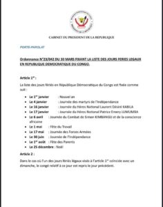 À en croire, Tina Salama, porte-parole du chef de l’État, qui l’a annoncé à travers son compte Twitter, l’ordonnance présidentielle consacrant cette journée fériée vient d’être signée par le président Félix Antoine Tshisekedi Tshilombo.