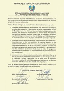 Réunis le 15 janvier à Kinshasa autour de Kengo, 48 heures avant la la célébration du 63ème anniversaire de l’assassinat de Patrice Lumumba, ces anciens Premiers ministres ont publié une déclaration commune dans laquelle «ils déplorent et condamnent avec véhémence les multiples agressions dont le pays fait l’objet dans sa partie Est et encouragent le Chef de l’État à poursuivre les efforts sur tous les fronts, tant diplomatiques que militaires, afin de résoudre cette situation qui perdure depuis plus de trente ans.