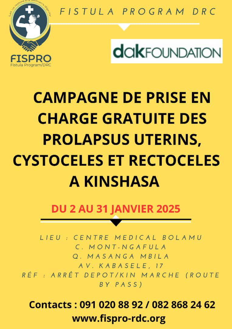 Situé au quartier Sanga Mamba dans la commune de Mont Ngafula à Kinshasa, en collaboration avec l’asbl FISPRO-RDC vient de lancer cette campagne pour informer toutes les femmes que la prise en charge est gratuite les femmes sujet des fistules obstétricales et prolapsus utérin.